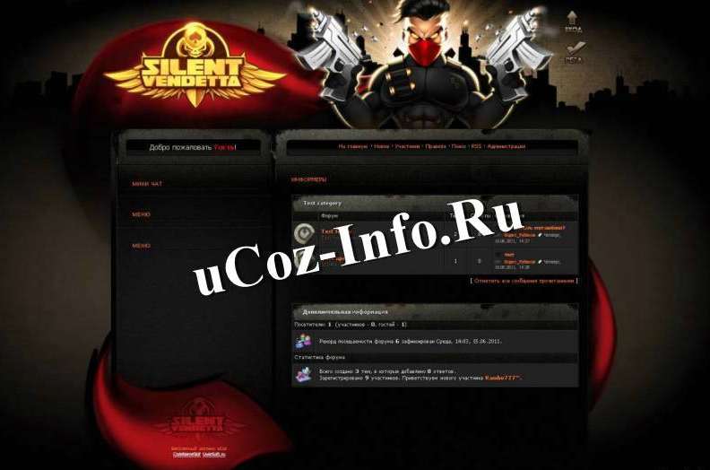 Шаблон SilentVindetta для форумов системы ucoz. Очень красивый шаблон для форумов игровой тематики. В архиве есть все необходимые детали и страницы для установки, а также сама инструкция по установке и настройке.