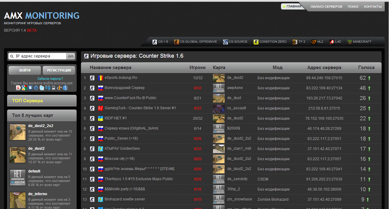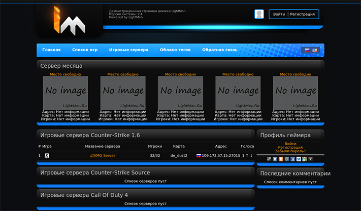 Красивейший шаблон мониторинга my-cs для monengine , в архиве лежит весь движок , так что если Вы делали какие то обновления на предыдущем своём web движке MonEngine , будьте готовы к тому что Вам придется переносить части кода в этот обновлённый скрипт MonEngine , шаблон очень красивый и уникален , создан в тёмно-оранжевых цветах , приятен для глаз , имеет красивое меню в шапке сайта , под меню находиться как по стандарту ТОП серверов , вип места отмечаются знаком P , так же осталась возможность выделять цветом сервера , как в мониторинге amxmonitoring...