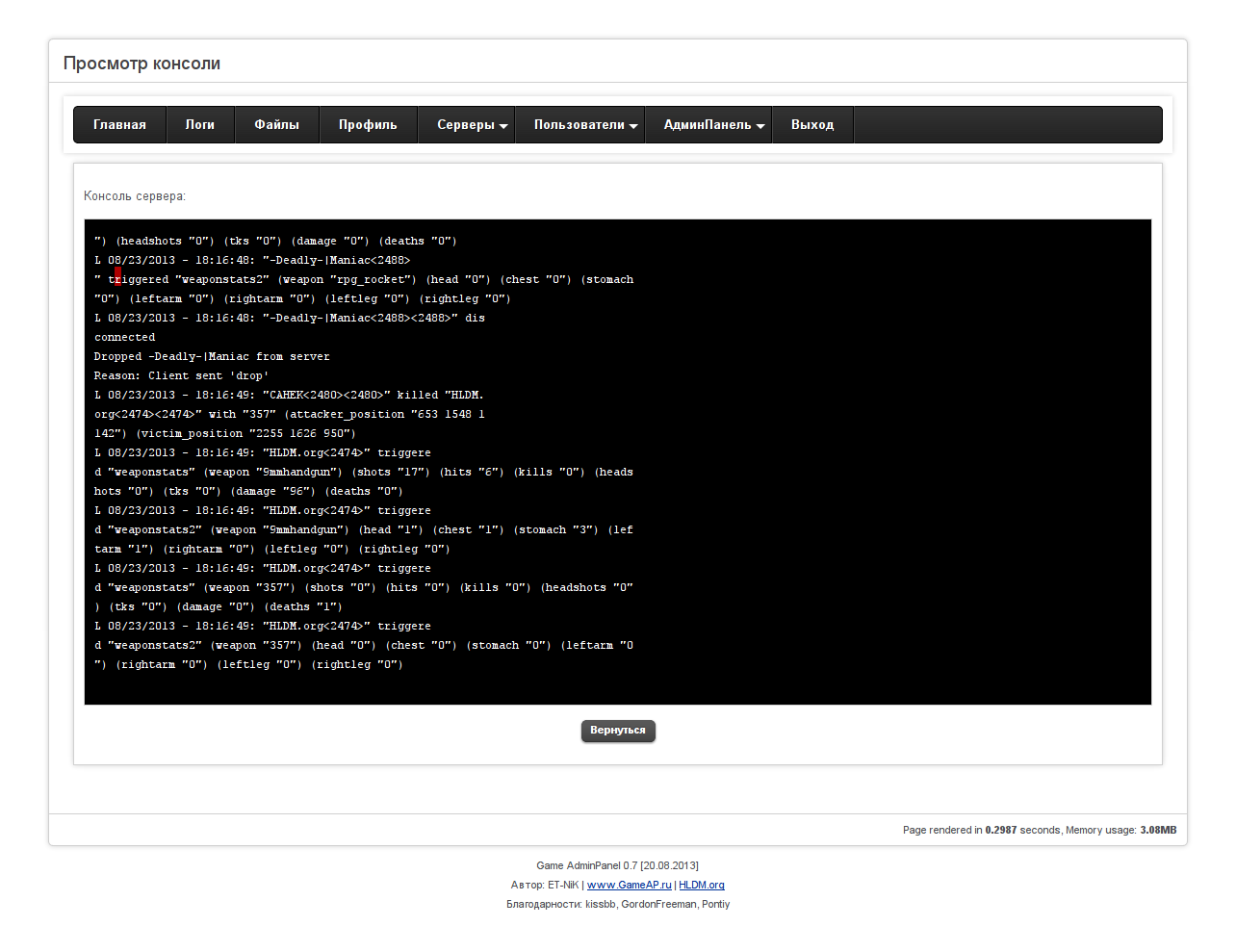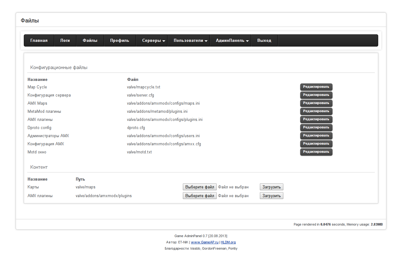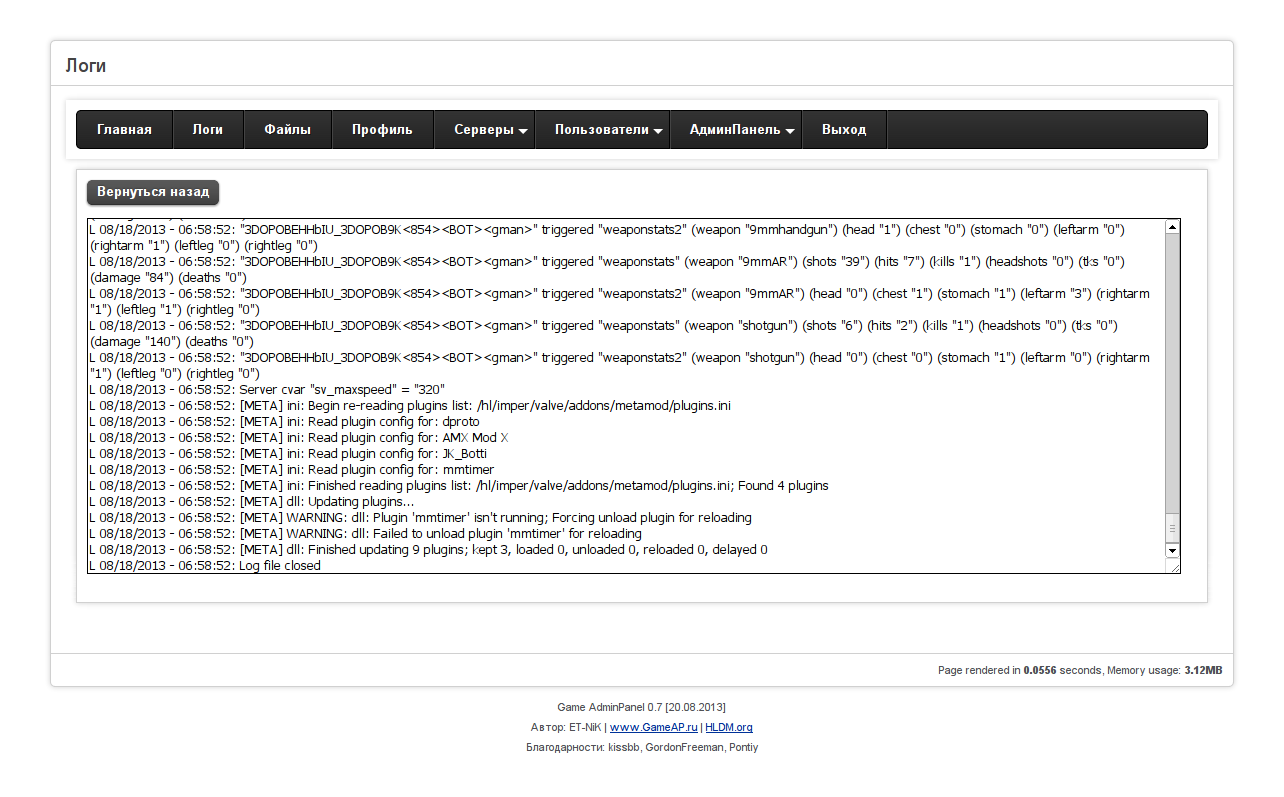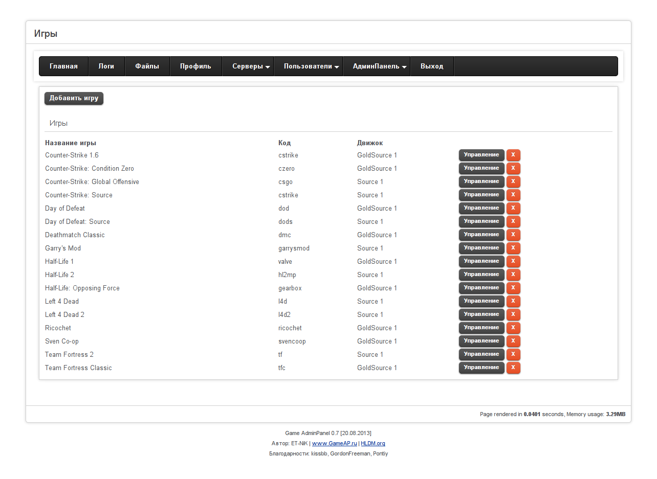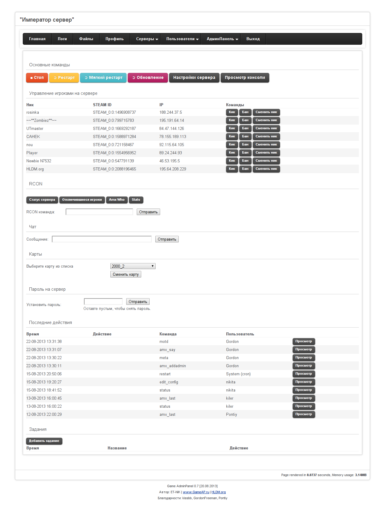 Game AdminPanel - онда из лучших бесплатны панелей управления игровыми серверами. Имеет возможность управлять серверами CS 1.6 , Half Life и другими играми на движке GoldSource и Source. Панель достаточно гибкая благодаря фреймворку CodeIgniter 2.1.3 , это полноценная ПУ в которую можно установить дополнительные модули , запустить как на Windows так и на Linux , полноценно работает с самыми популярные базами данных (MySQL, PostgreSQL и другими) Разработчик: ET-NiK Тестеры: kissbb, GordonFreeman, Pontiy Возможности Управление игровыми серверами на движке GoldSource и Source Поддержка операционных систем Linux и Windows Поддержка MySQL, PDO, PostgreSQL, Oracle, Microsoft SQL Server Мультиязычность Смена карт на сервере, остановка, перезагрузка серверов Просмотр логов серверов Управление игроками (бан, кик, смена ника) Отправка rcon команд на сервер Редактирование конфигурационных файлов (server.cfg, mapcycle.txt и др.) Загрузка игровых файлов (карт, плагинов) Создание пользователей с разными правами на определенные серверы Поддержка модулей Регистрация пользователей (при необходимости выключается) Автоматическая установка серверов Требования Требования для web-сервера ОС Linux или Windows; PHP версии 5.1 и выше; GD модуль PHP; SSH2 модуль PHP; Включенные функции FTP на PHP; Требования для игрового сервера (Linux) Screen; Настроенный SSH (для удаленного сервера); Настроенный FTP (для удаленного сервера); Утилита SteamCMD. Для установки игровых серверов с серверов Valve; Требования для игрового сервера (Windows) Настроенный Telnet или SSH (для удаленного сервера); Настроенный FTP (для удаленного сервера); Права администратора; Утилиты 7-zip и wget. Для установки игровых серверов из репозиториев; Утилита SteamCMD. Для установки игровых серверов с серверов Valve;