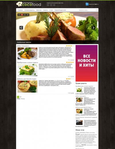 Это отличный инструмент для организации ресурсов посвященных кулинарии. Шаблон Cooking Club для DLE 10.3 очень качественно оформлен, это можно увидеть из цветовой гаммы интерфейса, кроме того, функционал шаблона очень презентабельный и располагающий к тому, чтобы пользователь опробовал все функции.